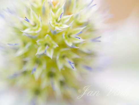 De bloemen van de zeedistel staan in een bloemhoofdje, dat als het ware gedragen wordt door de kelkbladen die voorzien zijn van een lange stekel. De bloemen zijn blauw van kleur, maar kunnen soms ook meer naar wit neigen. De bloemen verschijnen vanaf juni en zijn soms tot in september nog te zien. Deze foto toont een detail van de bloemen. Door het grote diafragma heb ik de scherptediepte heel erg beperkt, waardoor een deel van de stampers nog binnen het scherptebereik is gekomen. Er is, vind ik tenminste, op deze manier wel een heel apart beeld ontstaan. Hoe je de foto ook maakt; de blauwe zeedistel is op vele manieren fotogeniek.