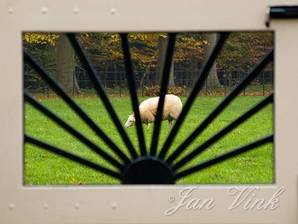 Schaap, in weiland achter spijlen in hek, Landgoed Elswout