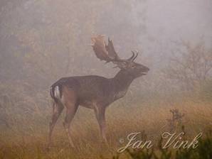 Damhert, bok, burlen, knorren, in de mist, Amsterdamse Waterleiding Duinen